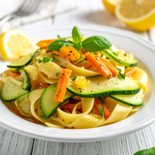 Makaron ugotuj. Warzywa pokrój w paski i podsmaż na oliwie. Dodaj makaron, skrop cytryną i dopraw. Proste i lekkie danie na szybki obiad.