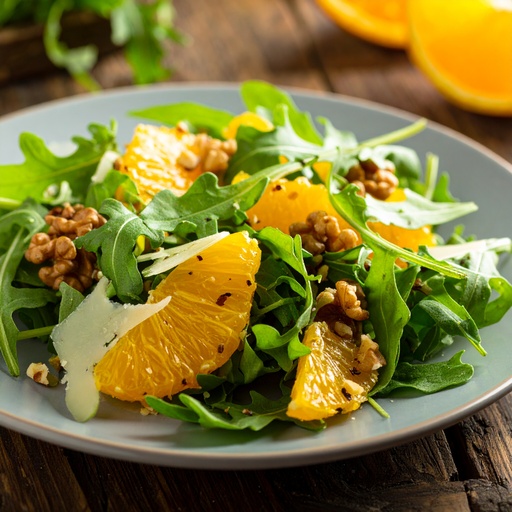 Rukolę ułóż na talerzu. Pomarańczę obierz i pokrój na kawałki. Dodaj orzechy. Skrop oliwą i miodem. Lekka, świeża sałatka idealna na przełom sezonów.