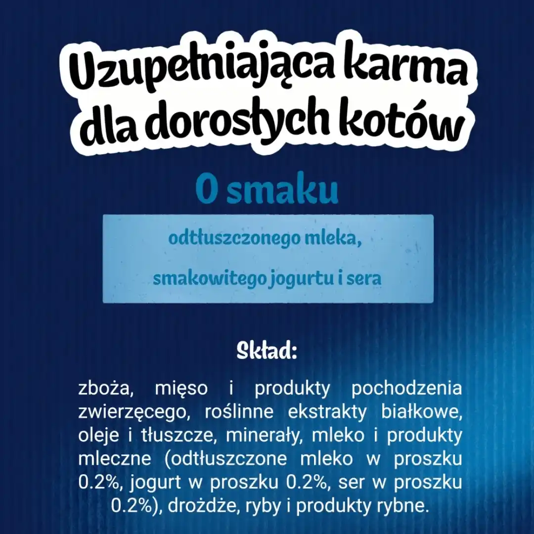 ✅ O obniżonej zawartości laktozy, dzięki czemu nie powinna wpływać negatywnie na trawienie Twojego kota