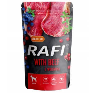 Mokra karma Rafi z wołowiną charakteryzuje się wysoką zawartością pełnowartościowego białka, przy niskiej zawartości tłuszczu. Oprócz tego mięso i surowce pochodzące z wołowiny są cennym źródłem lizyny i histydyny. Ważnymi substancjami są również kwasy tłuszczowe z rodzin n-3 i n-6, regulujące pracę wielu funkcji życiowych dorosłych psów. Karma zawiera żelazo zapewniające prawidłową gospodarkę krwi, a także selen i cynk, pokrywając dzienne zapotrzebowanie na te składniki. Receptura została wzbogacona o dodatek borówki i żurawiny, które dzięki występujących w nich związkach biologicznie czynnych, głównie procyjanidyn i flawonoidów, wykazują silne właściwości przeciwutleniające i przeciwzapalne. Tymianek z kolei działa antybakteryjnie i korzystnie wpływa na funkcje trawienne.