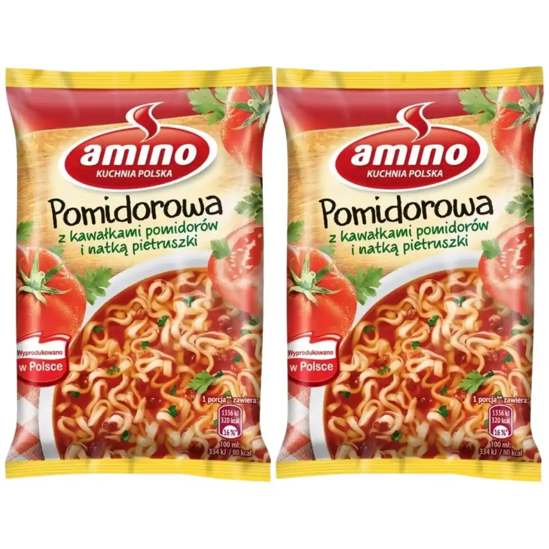 Pomidorowa z kawałkami pomidorów i natką pietruszki zupa błyskawiczna. Też czasem masz ochotę w środku zabieganego dnia usiąść na chwilę i zjeść coś dobrego? Zupa błyskawiczna Amino to doskonały sposób na zabicie małego głodu i nakarmienie kubków smakowych smakiem tradycyjnej, polskiej kuchni. Ta zupa błyskawiczna Amino to klasyczna polska pomidorowa w zupełnie nowej odsłonie. Uprawiane w zrównoważony sposób pomidory i natka pietruszki w towarzystwie przypraw, przepysznych klusek komponują się w aromatyczną zupę, która natychmiast Cię rozgrzeje i nasyci. Będzie smacznie jak u mamy! Nie musisz martwić się składnikami: danie instant od Amino to przekąska bez konserwantów i sztucznych barwników, za to pełna smaku i aromatu. Wszystkie Zupki Amino są teraz dostepne w nowej wersji, z nudlami smażonym w oleju słonecznikowym. Dzięki zastosowaniu olej słonecznikowego obniżyliśmy o ponad 30% zawartość nasyconych kwasów tłuszczowych. Danie nie wymaga długich przygotowań. Zupę zrobisz błyskawicznie – wystarczy Ci jedynie 5 minut! Zagotuj wodę, zalej nią makaron i zawartość saszetki, odczekaj od 3 do 5 minut i gotowe! Pomidorowy zawrót głowy – czas start! Zupa świetnie się sprawdzi jako szybka przekąska pomiędzy zajęciami domowymi, jak i danie instant, które bez problemu przygotujesz podczas przerwy w pracy, gdzie do dyspozycji masz tylko kubek i czajnik. Od dziś, szykując się do pracy, nie zapomnij do torby wrzucić zupy błyskawicznej i bądź zawsze przygotowany na zabicie małego głodu! Czekają na Ciebie także inne smaki zup błyskawicznych Amino: barszcz czerwony z dodatkiem majeranku, gulaszowa z wieprzowiną i papryką, czy kurkowa. Amino - kuchnia polska