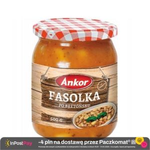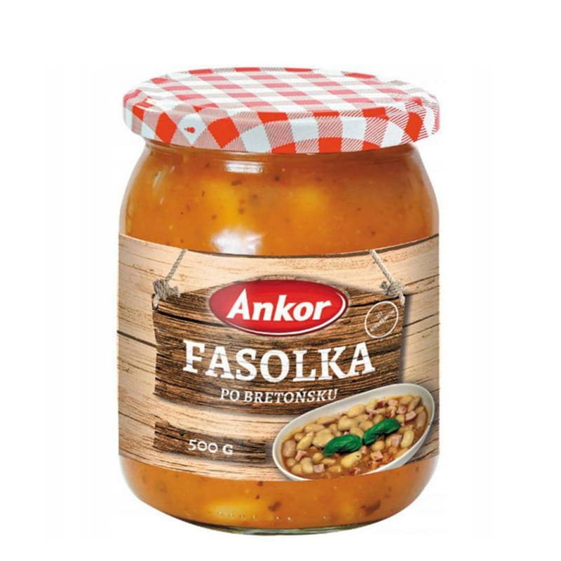 Ankor Fasolka po bretońsku Fasola biała z dodatkiem mięsa, kiełbasy wieprzowej i sosu pomidorowego. Produkt sterylizowany.