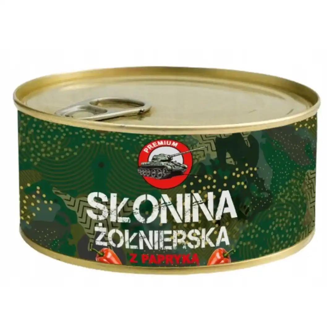 Chrupiąca i aromatyczna słonina żołnierska z papryką to wyjątkowa konserwa mięsna z wyrazistym smakiem prażonej słoniny i słodko?ostrym dodatkiem papryki. Przygotowana według prostej receptury, z podstawowych składników: słonina wieprzowa, sól, papryka słodka i ostra oraz przyprawy. Produkt sterylizowany, pozbawiony konserwantów chemicznych, idealny jako samodzielna przekąska, dodatek do grzanek czy składnik tradycyjnego obiadu. Smakuje najlepiej na zimno lub lekko podgrzewany. Świetny wybór dla miłośników klasycznych smaków wojskowych racji.