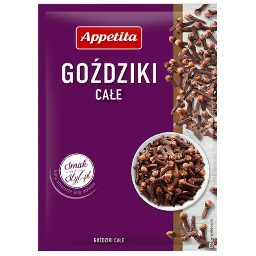 Appetita Goździk Suszone pączki kwiatowe drzewa goździkowego, to jedna z najbardziej charakterystycznych przypraw. Słodko-gorzki, korzenny smak goździków idealnie współgra z wypiekami i deserami, ale znajduje swoje zastosowanie także w pikantnych daniach. Podkreśla smak marynat, ryżu i potraw z dziczyzny. Goździki podkreślają również aromat grzanego wina, piwa oraz likierów.