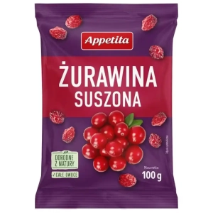 Żurawina cała, suszona, słodzona. Żurawina suszona to idealna przekąska lub smaczny dodatek do: musli, dań mięsnych i serów pleśniowych.
