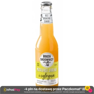 Napój lekko gazowany na bazie soku tłoczonego z jabłek i cytryny. Wzbogacony w witaminę C. Pasteryzowany. Bracia Sadownicy Musujące Jabłko i Cytryna 275?ml to lekko gazowany napój powstały na bazie tłoczonych soków owocowych, rozcieńczone wodą i nasycone bąbelkami dwutlenku węgla. Produkt nie zawiera dodanego cukru - słodycz pochodzi wyłącznie z naturalnie występujących cukrów w owocach.