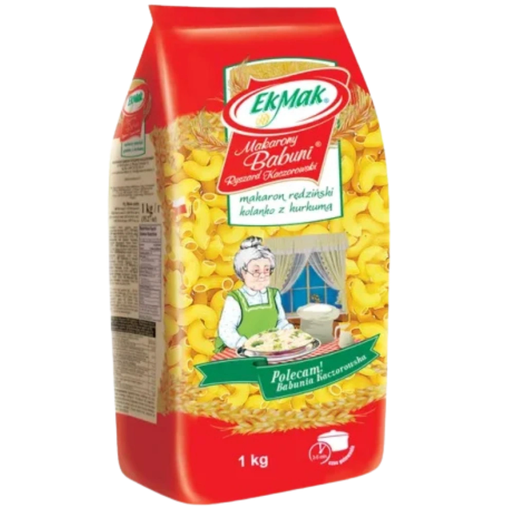 Eko Mak Makaron Babuni Kolanko 1kg Makarony Babuni to najwyższej jakości wyroby, które, swoim wyśmienitym i niepowtarzalnym smakiem trafiają do coraz liczniejszego grona smakoszy. Ich produkcja oparta jest o tradycyjną metodę wytwarzania z udziałem starannie dobranych surowców, tj. jaja i odpowiednie gatunki mąk.