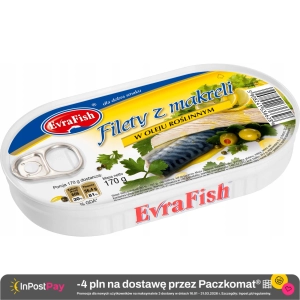 Evrafish Filet z makreli w oleju Wyniki licznych badań dowodzą, iż przetwory rybne ze względu na swoje wartości odżywcze można zaliczyć do żywności mającej pozytywny wpływ na zdrowie konsumenta. Filety z makreli w oleju to wyśmienita przekąska wyprodukowana z najwyższej jakości mięsa makreli.