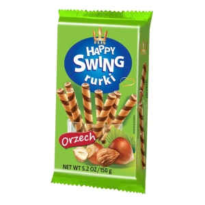 Rurki Happy Swing orzechowe Skosztuj wyśmienitych rurek nadziewanych kremem o wyjątkowo intensywnym smaku orzechowym. Ten produkt jest idealny dla całej rodziny.