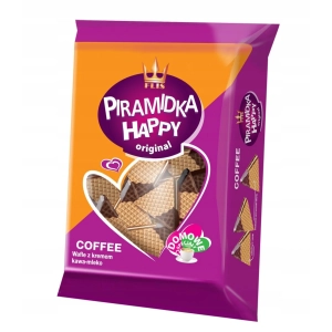 Flis Wafle Piramidka Happy Original kawowo- mleczne 600 g Wafelki chrupiące a zarazem bardzo lekkie z delikatnym kremem kawowo-mlecznym w kształcie piramidek z czubkiem oblanym czekoladą. Spróbuj, a pokochasz ten trójkątny smak radości.