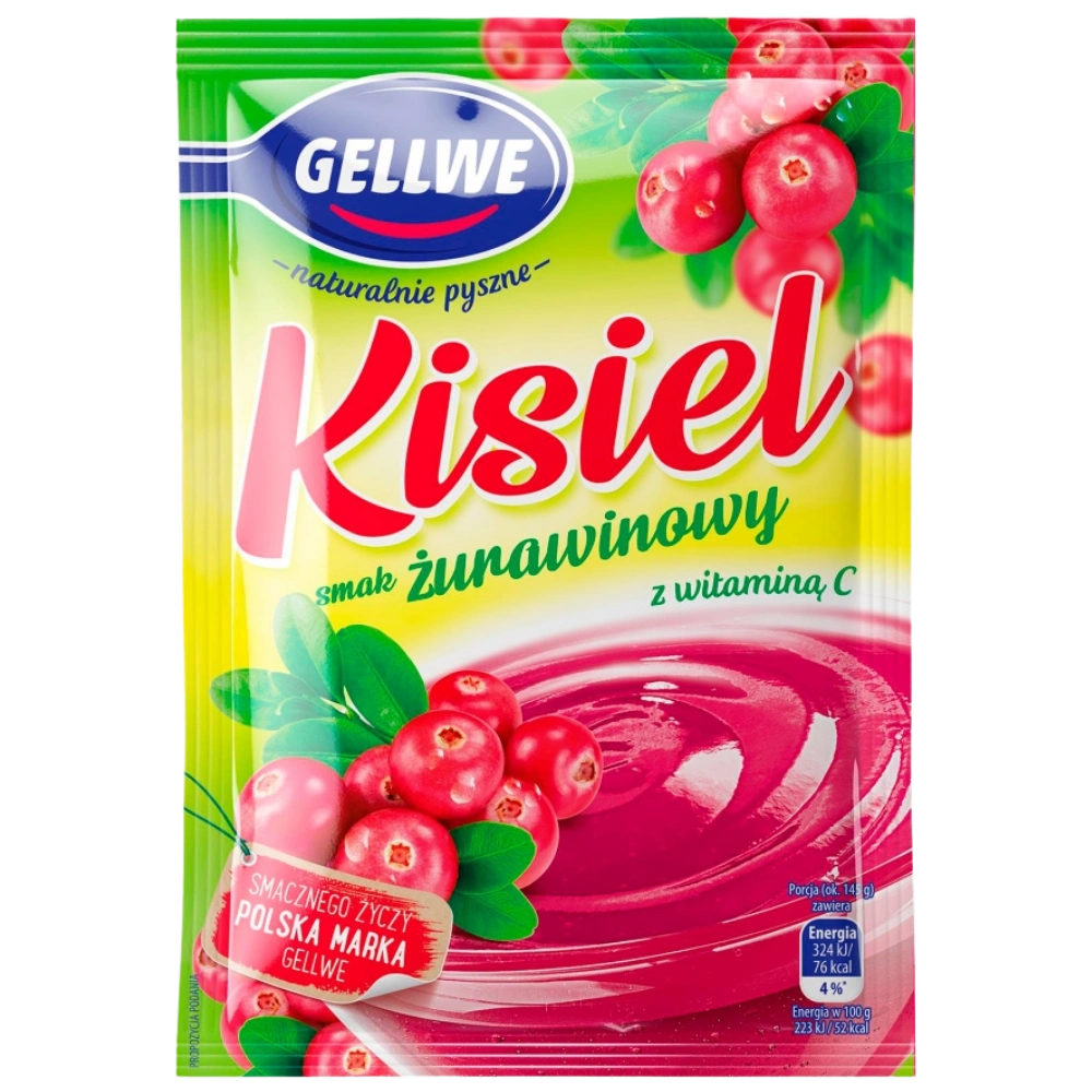 Kisiel w proszku o smaku żurawinowym z witaminą C. Gellwe - naturalnie pyszne Smacznego życzy polska marka Gellwe