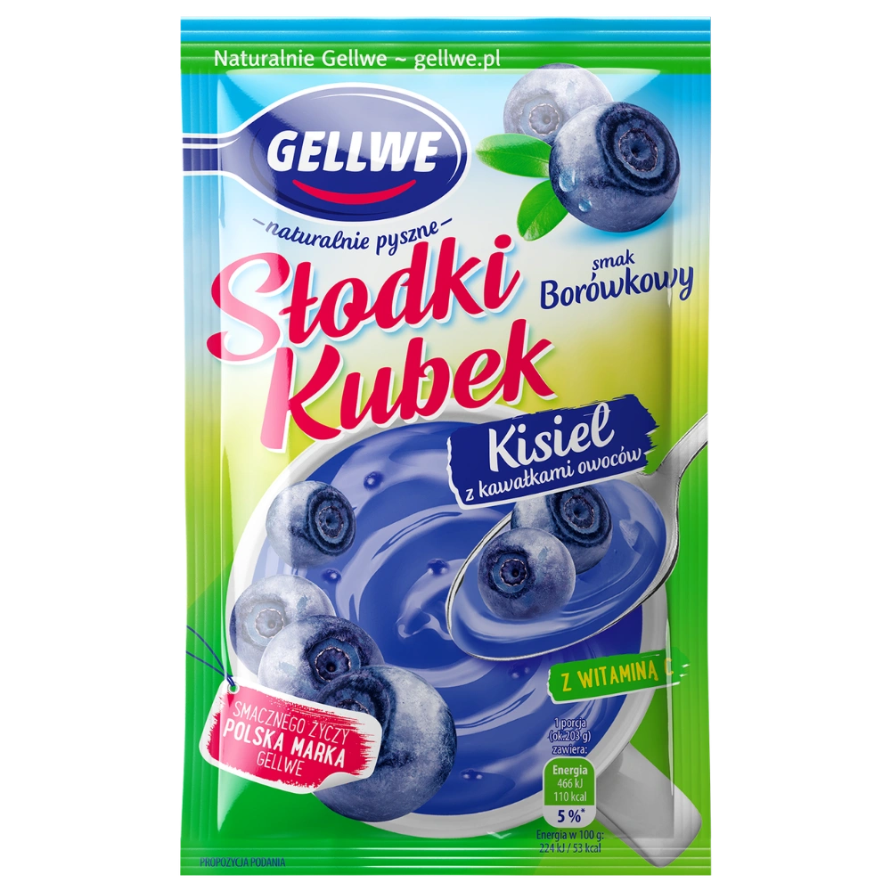 Gellwe Słodki Kubek Kisiel z kawałkami owoców o smaku borówkowym 28 g Kisiel w proszku o smaku borówkowym z kawałkami owoców i witaminą C. Gellwe - naturalnie pyszne
