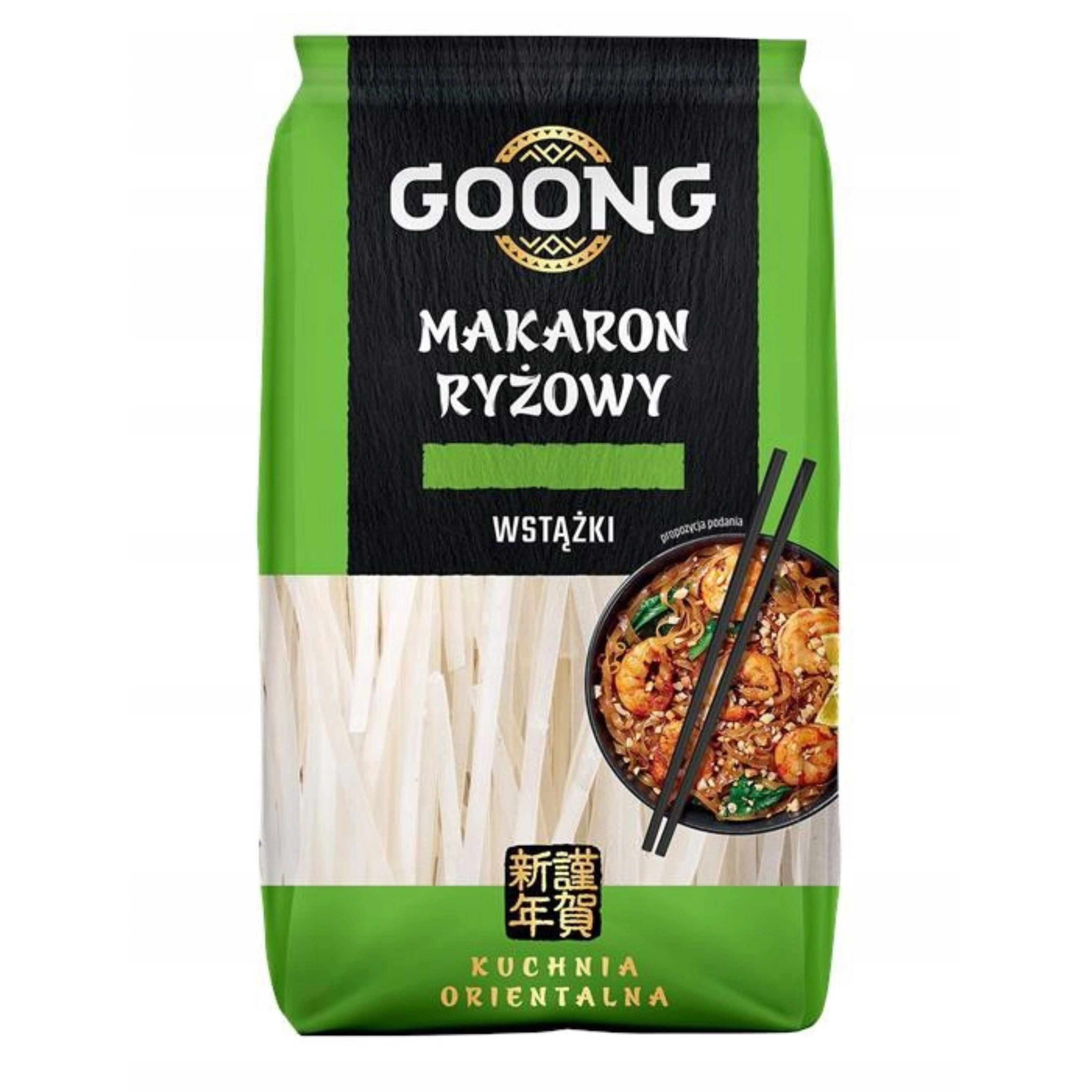 Goong Makaron Ryżowy wstążki Makaron Ryżowy bezglutenowy marki Goong świetne nadaje się jako dodatek do dań kuchni azjatyckiej. Wstążki stanowią podstawę na przykład do słynnego tajskiego Pad Thaia. Makaron ryżowy doskonale komponuje się z sosami, mięsami, warzywami, a także owocami morza. Jest wyjątkowo lekki i niskokaloryczny, dlatego polecany jest dla wszystkich, którzy pozostają na diecie. Produkt jest bezpieczny dla chorujących na celiakię.