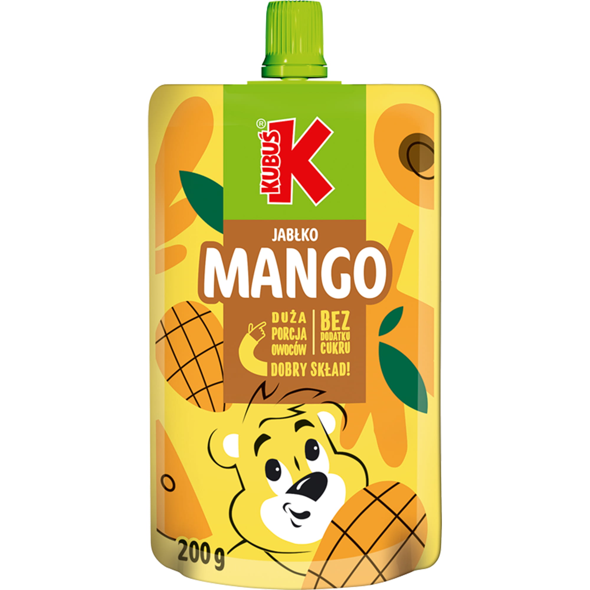 Mus o smaku jabłko-mango. Pasteryzowany. Bez dodatku cukrów. Zawiera naturalnie występujące cukry.
