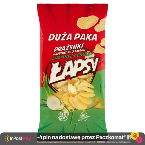 Łapsy Prażynki karbowane o smaku zielonej cebulki 110g Producent marki Łapsy opisuje Prażynki ziemniaczane o smaku zielonej cebulki tak: duża paka, wzmacniaczy bez smaku, bez oleju palmowego, Polski Producent