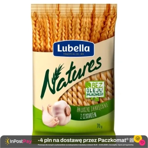 Paluszki z czosnkiem. Lubella Natures to delikatnie wypiekane paluszki bez dodatku oleju palmowego. Zamknęliśmy w nich to, co najlepsze ze zboża. Z uwagi na wyjątkowy sposób wypieku, produkt może charakteryzować się zwiększoną łamliwością. Lubella Tradycja od 1881 Spróbuj także Lubella Natures Paluszki zakręcone z solą morską.
