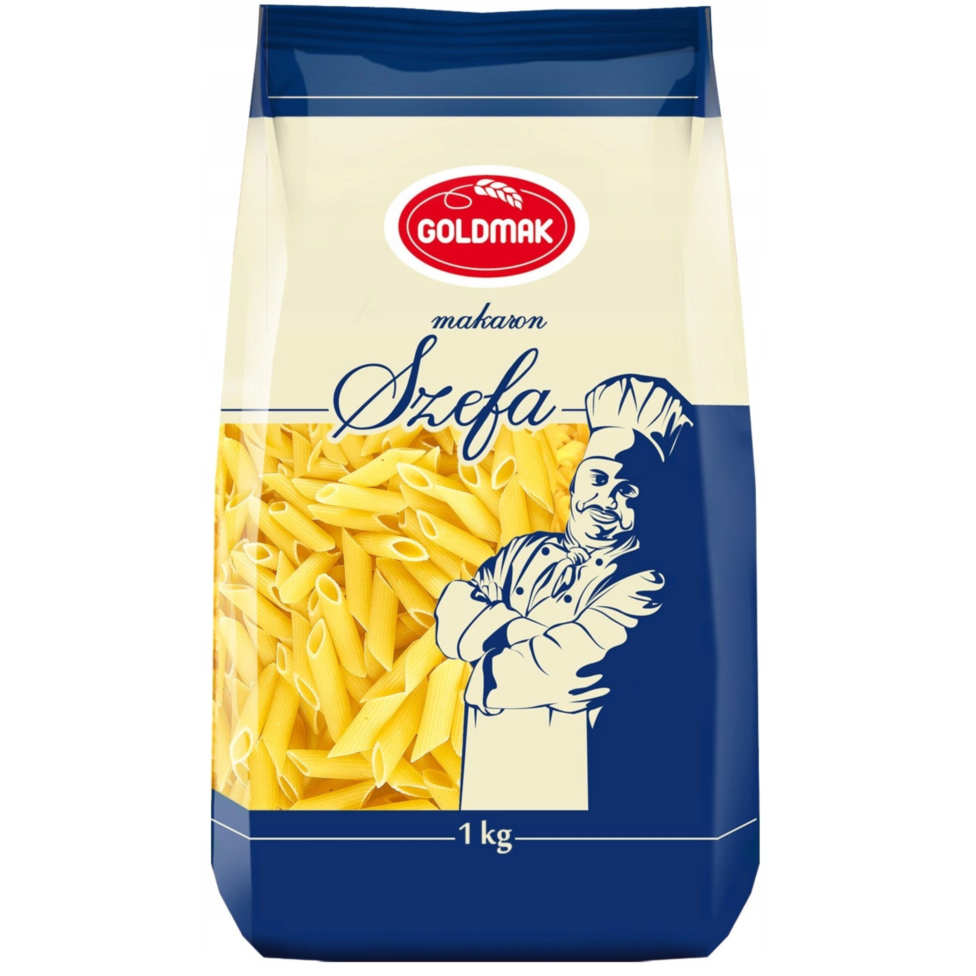 Makaron Goldmak szefa penne 1kg GOLDMAK to firma rodzinna i liczący się na polskim rynku producent makaronów, z nowoczesnymi i wydajnymi liniami produkcyjnymi, współpracujący ze sprawdzonymi, polskimi dostawcami wysokiej jakości mąk oraz jaj. Oferujemy Państwu zarówno makarony walcowane jak i tłoczone. Do produkcji krajanek, czyli makaronów walcowanych, używamy jaj oraz wysokiej jakości mąki makaronowej, co daje gwarancję dobrego smaku. Makarony tłoczone to z kolei szeroki wybór kształtów wykorzystywanych jako dodatek do dań głównych, zup i sałatek. Sprzedajemy nasze produkty na terenie całego kraju, jak również za granicą.