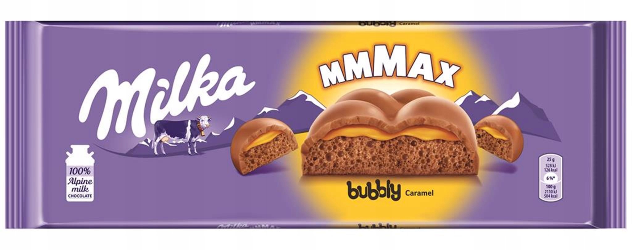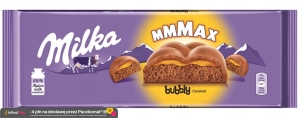 Milka Czekolada mleczna bubbly caramel Czekolada mleczna z mleka alpejskiego w środku napowietrzona (40%) z nadzienem karmelowym (19%). Milka – Delikatność w sercu. Pyszna, mleczna czekolada wyprodukowana w 100% z alpejskiego mleka. Zachęca do delikatności od 1901 roku, czule dotykając Waszych podniebień i serc.