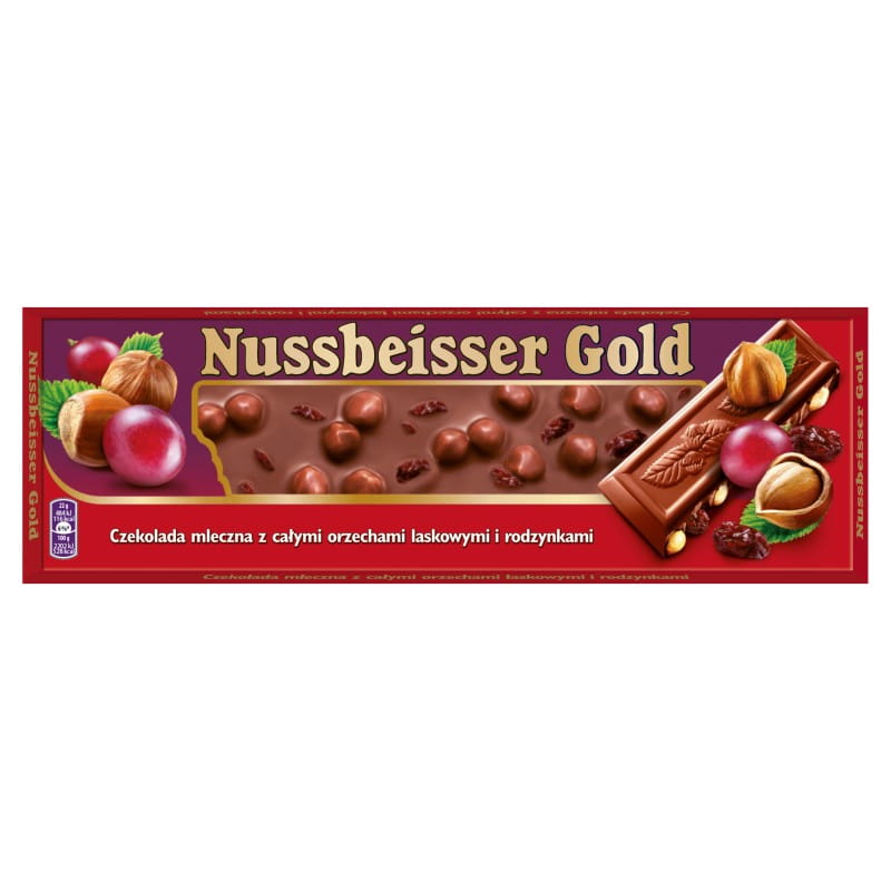 Nussbeisser Gold Czekolada mleczna z całymi orzechami laskowymi i rodzynkami 220 g