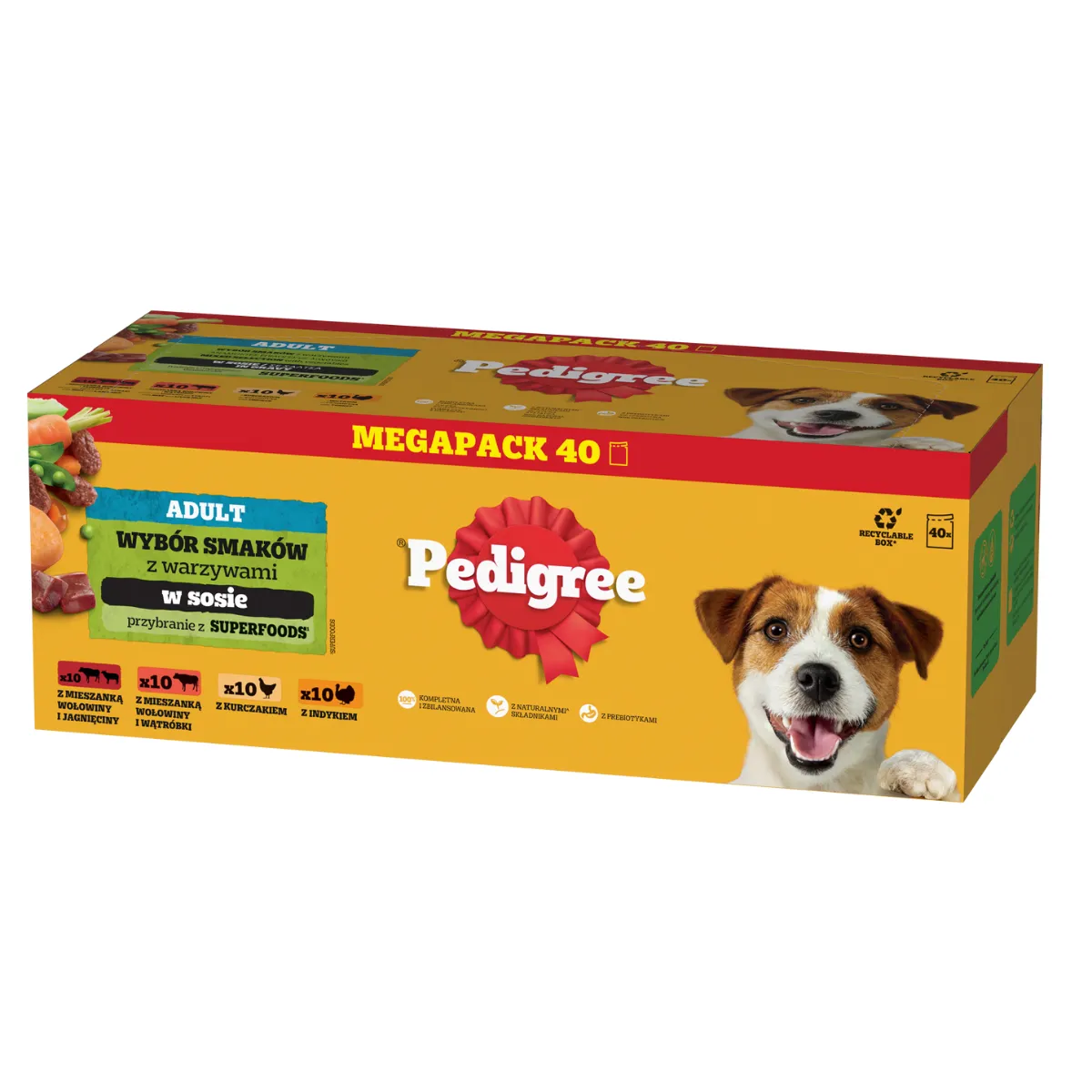 Mokra karma PEDIGREE® Adult Wybór Smaków z warzywami w aksamitnym sosie to pełnoporcjowe pożywienie przeznaczone dla dorosłych psów. Nasze receptury na sosy zawierają superfoods, takie jak: jabłko, źródło witaminy C i błonnika oraz słodkie ziemniaki, źródło potasu. Twój pies rozsmakuje się w czterech wyśmienitych smakach: z mieszanką wołowiny i jagnięciny, z mieszanką wołowiny i wątróbki, z kurczakiem, z indykiem. Receptura została opracowana przez lekarzy weterynarii i specjalistów ds. dietetyki z Instytutu Nauki o Zwierzętach WALTHAM™. Zawiera w składzie witaminę E i przeciwutleniacze, które posiadają właściwości antyoksydacyjne i wspomaga naturalne mechanizmy obronne Twojego psa oraz cynk, który wspiera zdrową skórę i sierść, aby pomóc Twojemu psu wyglądać i czuć się świetnie. Karma PEDIGREE® zawiera naturalne włókno pokarmowe i prebiotyki, które pomagają utrzymać zdrowe jelita bo każdy pies zasługuje na zdrowy brzuszek.
