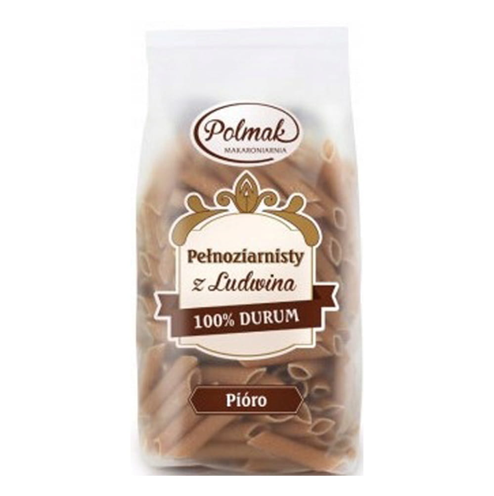 Polmak Makaron Pełnoziarnisty pióro Makaron „Pełnoziarnisty z Ludwina” powstaje z mąki z przemiału całych ziaren wyłącznie pszenicy durum. Zmielenie łuski, jądra i kiełka ziarna sprawia, że mąka ta zawiera więcej składników odżywczych, niż mąka biała. Zmielenie całych ziaren powoduje, że makarony z pełnego przemiału są ciemniejsze od tradycyjnych, z mąki makaronowej.