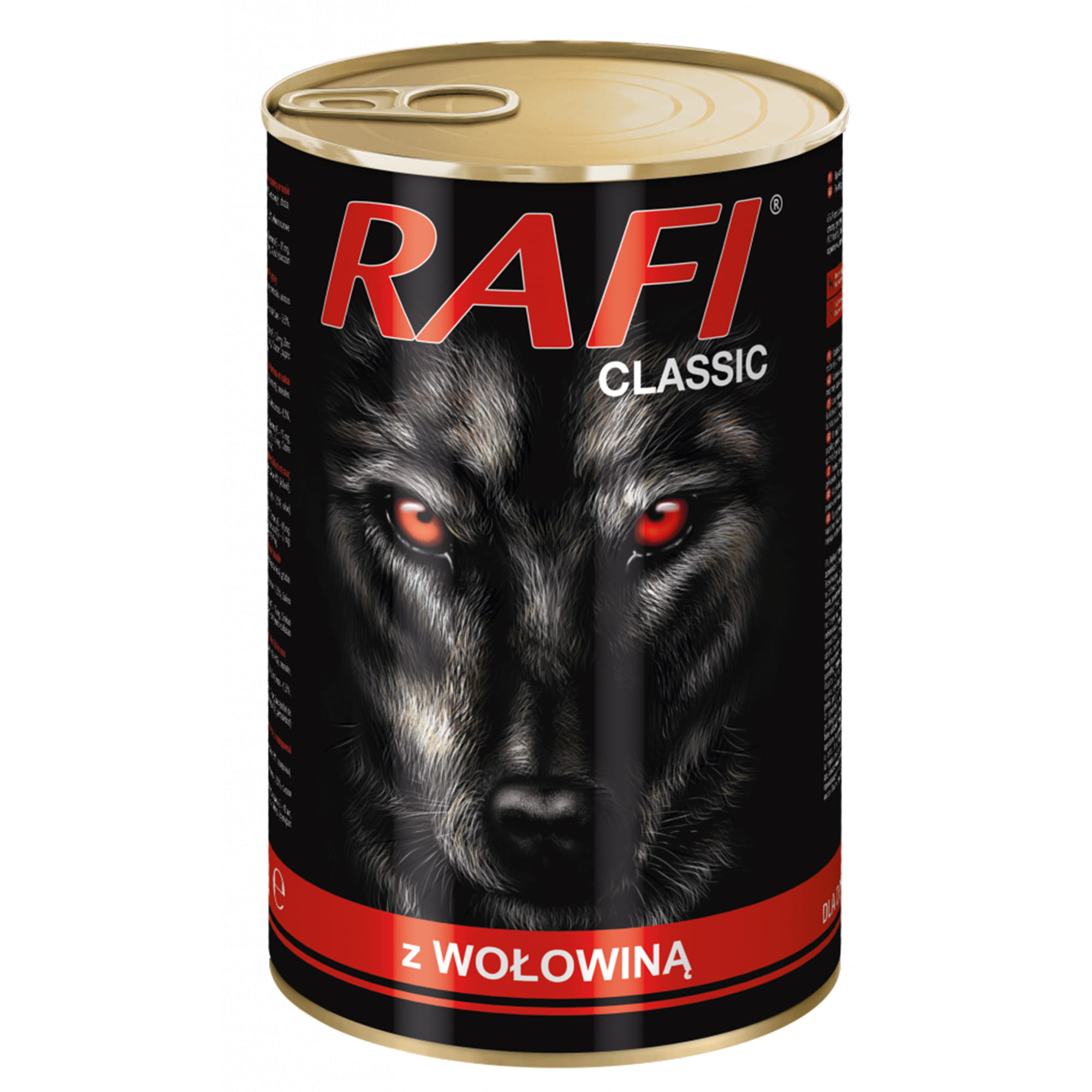 Karma Rafi Classic z wołowiną jest przeznaczona dla dorosłych psów należących do ras średnich i dużych. Jest to karma pełnowartościowa i pełnoporcjowa, dzięki czemu może pełnić funkcję głównego posiłku w diecie psa. Skład karmy Rafi został dokładnie przemyślany i ułożony przy wsparciu specjalistów z dziedziny żywienia zwierząt. Głównym składnikiem karmy jest mięso oraz produkty pochodzenia zwierzęcego (aż 65%), które powinny stanowić podstawę w psiej diecie. Charakteryzuje ją również zrównoważona zawartość substancji mineralnych i odżywczych, niezbędnych do prawidłowego funkcjonowania psiego organizmu. Są to: kwasy tłuszczowe z rodziny omega 3 i 6, białko zwierzęce o wysokim stopniu strawności, witaminy (A, D, E), aminokwasy, mikro i makroelementy (cynk, mangan, miedź, jod).