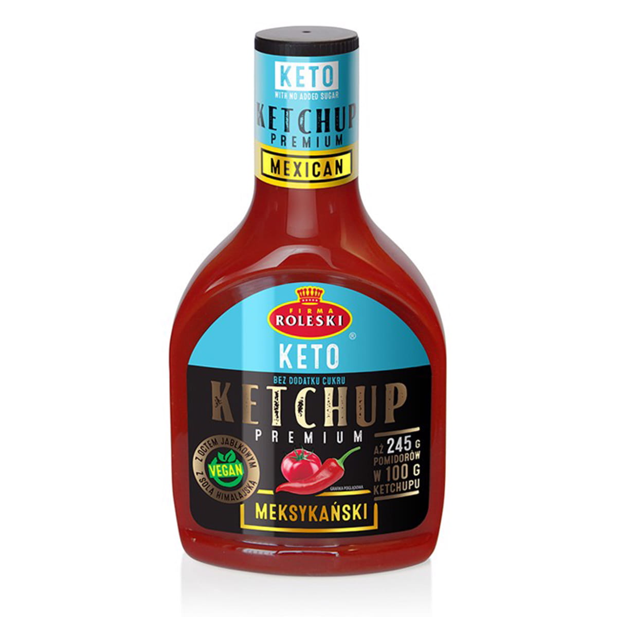 Ketchup Premium Meksykański Keto 425g Kup online Kup w Ketchup Premium Meksykański to smak meksykańskiej salsy uzyskany z połączenia soczystych pomidorów (aż 245 g na 100 g ketchupu) z czerwoną papryką oraz dodatkiem delikatnego octu jabłkowego i soli himalajskiej. Bez dodanego cukru, bez skrobi i bez substancji konserwujących. Ketchup Premium Meksykański Keto zawiera cukry naturalnie występujące w pomidorach. Odpowiedni dla wegan. Spróbuj! Polubisz. Roleski.