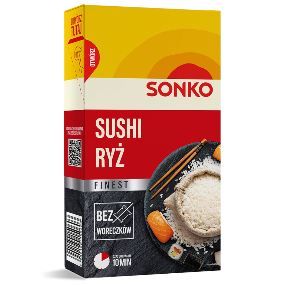 Sonko Finest stworzyliśmy z myślą o tych, którzy cenią naturalny smak, najwyższą jakość i świadome wybory. Nasz ryż pakowany jest luzem w kartoniku – bez plastikowych woreczków, bez zbędnych dodatków, bez mikroplastiku w żywności. To ekologiczne rozwiązanie, które wspiera redukcję odpadów i realnie zmniejsza ślad węglowy. Wybierając nasze opakowanie, wybierasz mniej plastiku, więcej natury – bez kompromisów w kwestii wygody czy trwałości produktu. Dodatkowo, opakowania zawierają system Smart Opening ułatwiający dozowanie i wysypywanie produktu. Ryż sushi jest to ryż biały okrągły, który po ugotowaniu ma miękką, lepką i aksamitną konsystencję. Dzięki temu łatwo można z niego formować sushi i cieszyć się jego wyśmienitym smakiem