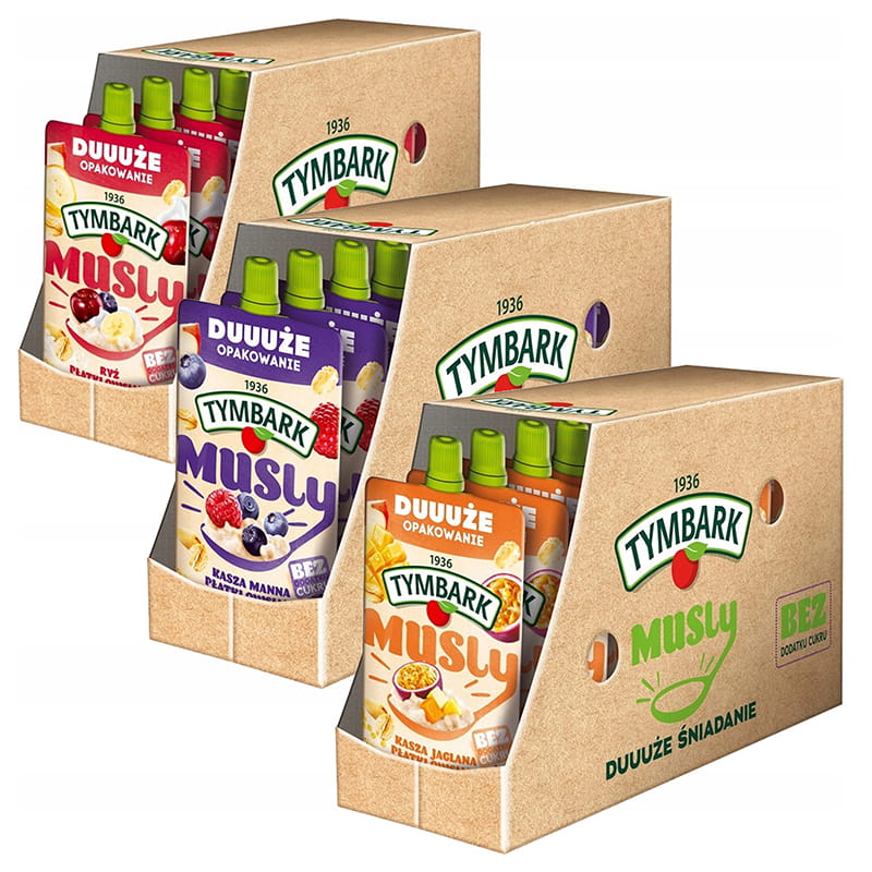 Zestaw 3 smaków musów owocowych Tymbark Musly. Zestaw zawiera: -Tymbark Musly Mus kasza manna owoce leśne 170 g x 10 -Tymbark Musly ryż płatki owsiane jabłko banan aronia 170 g x 10 -Tymbark Musly Mus kasza mango marakuja 170 g x 10