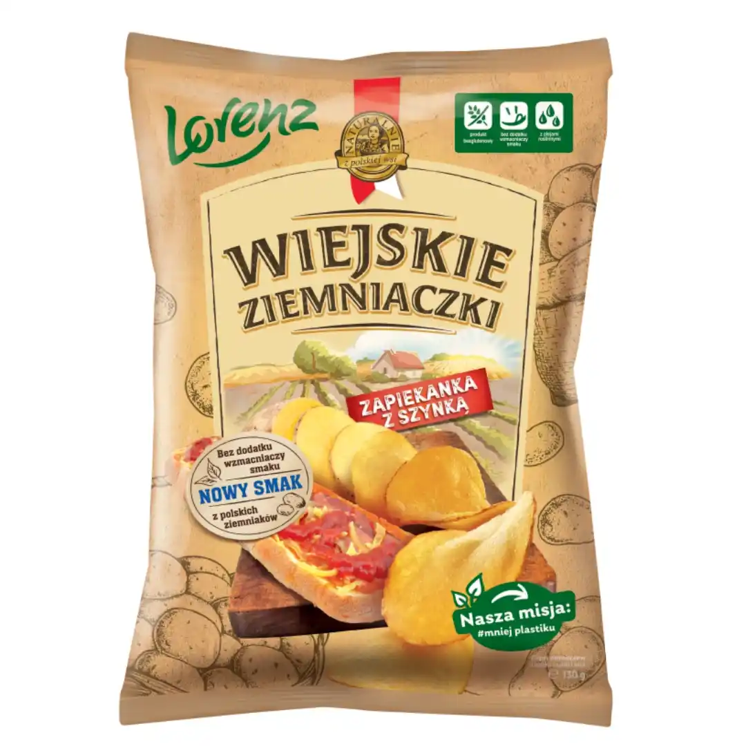 Chipsy ziemniaczane o smaku szynki i sera. Wiejskie ziemniaczki Nasze chipsy! Ziemniak, kartofel, pyra, grula... niezależnie od tego jak je nazwiemy, smak jakość mają w naturze. Możesz nam wierzyć, bo na ziemniaczkach znamy się jak mało kto! Dbamy, aby wszystkie surowce pochodziły od sprawdzonych dostawców. Połączenie aromatycznych przypraw i wysokiej jakości olejów roślinnych sprawia, że Wiejskie Ziemniaczki są tak wyjątkowe! Do produkcji chipsów nie używamy dodatku wzmacniaczy smaku. Dzięki temu ich smak jest niepowtarzalny. Naturalnie z polskiej wsi Wieloletnia współpraca z polskimi rolnikami jest naszym standardem. Dzięki temu nauczyliśmy się wybierać wyłącznie najlepsze ziemniaki dla naszych chipsów, których produkcja odbywa się w Polsce.