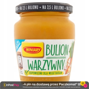 Pasteryzowany Bulion warzywny Winiary to: - esencja smaku warzywnego wywaru - wygodna alternatywa oszczędzająca czas - unikalna półpłynna konsystencja i wiele możliwości zastosowania - dopracowany skład i wyjątkowa receptura - produkt dostępny w wygodnym szklanym słoiczku - opakowanie 160 g wystarczy do przygotowania 3.5 l bulionu Wspólnie z Winiary możesz codziennie cieszyć się prawdziwie domowym posiłkiem, niezależnie od tego, jak wiele masz na głowie. Wygodne, odpowiednio bogate w wartości odżywcze i przede wszystkim smaczne - takie właśnie jest gotowanie z Winiary. Już od ponad 75 lat nasze produkty są jednymi z najczęściej wybieranych przez Polaków wyrobów kulinarnych. Jest to możliwe dzięki bogatemu portfolio marki zawierającemu ponad 200 różnorodnych dań, zup, bulionów, sosów, majonezów, przypraw, galaretek, kisielów oraz budyniów. Po sprawdzone przepisy, liczne inspiracje i pomysły na każdy dzień, zapraszamy Cię na winiary.pl, jedną z najpopularniejszych stron kulinarnych w Polsce.