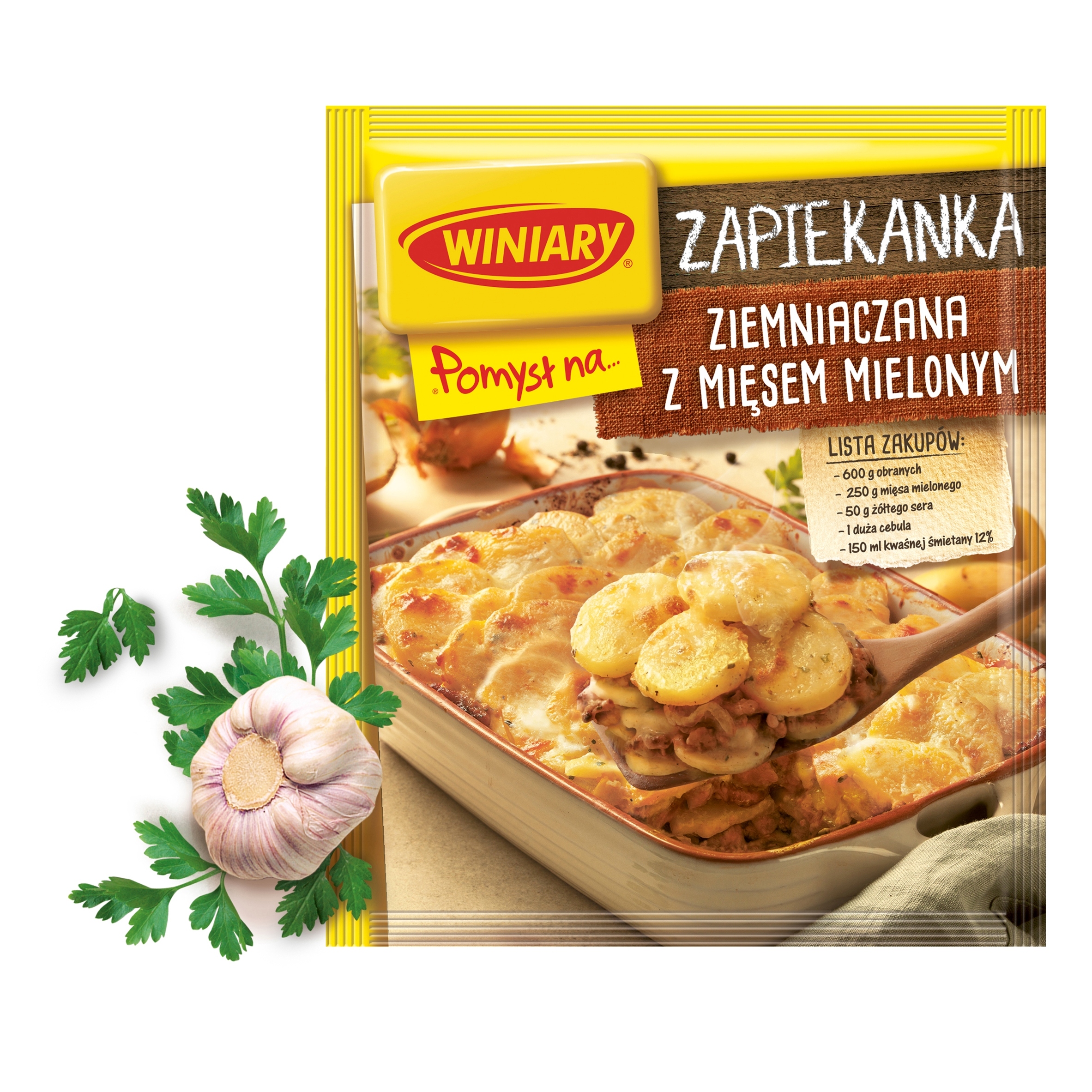 Kompozycja do przygotowania dania Zapiekanka ziemniaczana z mięsem mielonym. Winiary Pomysł Na… Zapiekankę ziemniaczaną z mięsem mielonym to propozycja na codzienny i sycący obiad. Dzięki aromatycznej mieszance suszonych warzyw i przypraw danie jest doskonale przyprawione, a w połączeniu z świeżymi warzywami może być częścią zbilansowanego i wartościowego posiłku. Doskonały posiłek będzie gotowy w 60 minut! Wystarczy pokrojone składniki ułożyć na przemian w żaroodpornym naczyniu, dodać Pomysł na… Zapiekankę ziemniaczaną z mięsem mielonym wymieszany z wodą i śmietanką oraz posypać danie startym serem.
