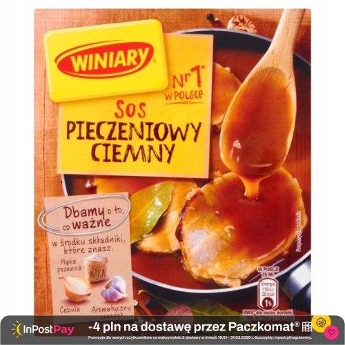 Sos Pieczeniowy Ciemny Winiary: - Nr 1* w Polsce - Dodaje smaku i soczystości mięsnym potrawom - Prosty sposób na urozmaicenie obiadu - Świetnie łączy kawałki mięsa z warzywami - Idealnie doprawiony