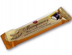 Baton z masy arachipanowo-marcepanowej ze skórką pomarańczową w czekoladzie.